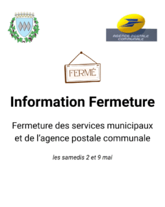 Nous vous informons que les services municipaux ainsi que l’agence postale communale seront fermés les samedis 2 et 9 mai. Merci de votre compréhension.