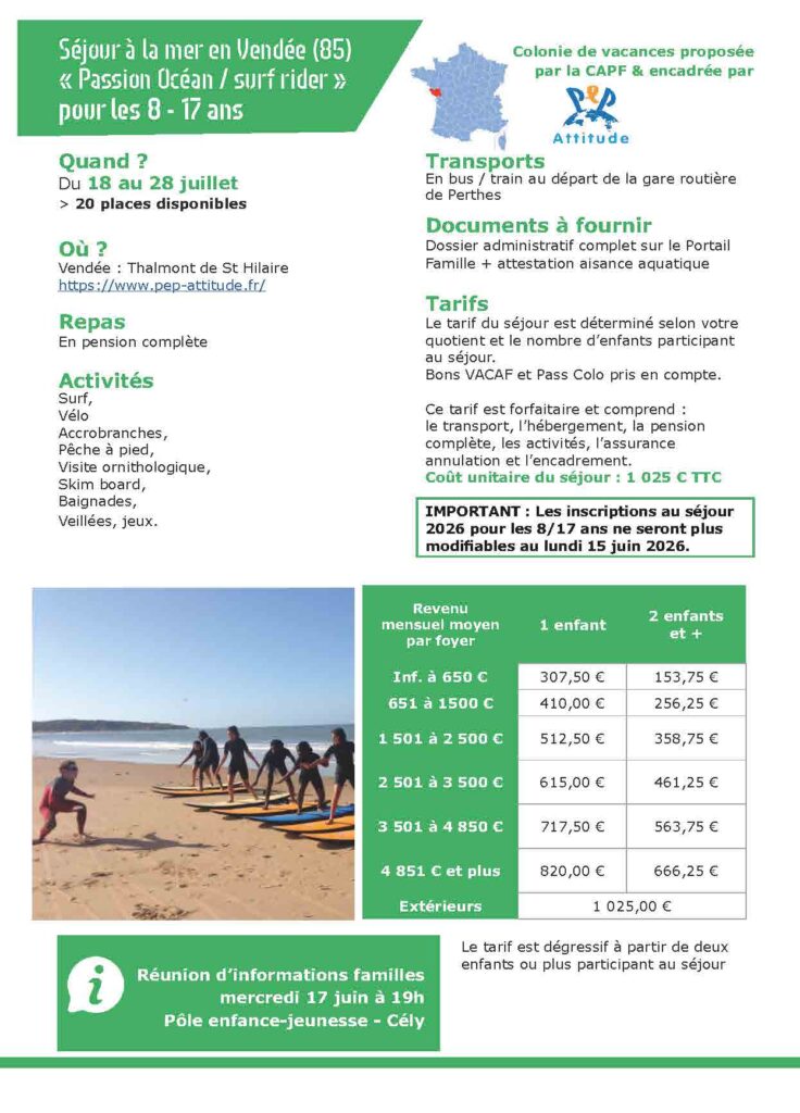 • Un séjour à la mer en Vendée « passion Océan/ Surf Rider » pour les 8-17 ans : 20 places